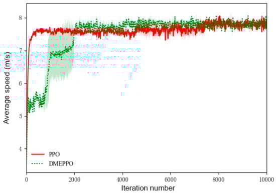 Figure 4 shows the agricultural vehicle’s speed trajectory during training. Since we set the maximum driving speed of the agricultural vehicle to 8 m/s during training and gave the speed-related operational efficiency the highest weight, both the system employing DMEPPO and the system employing PPO gradually converged to the highest operational efficiency of 8 m/s.