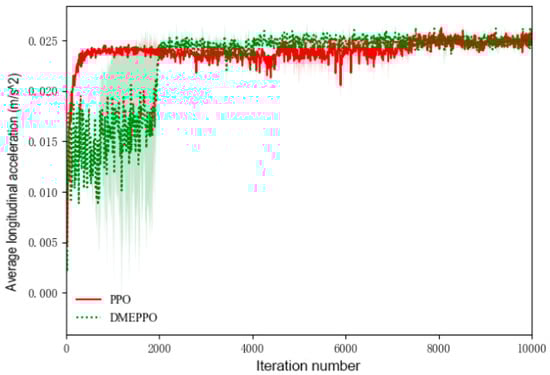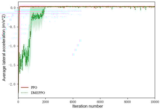 From Figure 5 and Figure 6, it can be seen that with an increase in the velocity, the longitudinal acceleration improved under DMEPPO and PPO and increased gradually from 0 to 0.025 m/s2, while the value of the lateral acceleration converged gradually from −2.0 m/s2 to about 0 and ultimately reached an equilibrium state at the highest score.