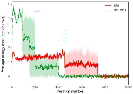 Figure 7 shows the energy consumption training curves, and it can be seen that as the number of training steps increased, both the system employing DEMPPO and the system employing PPO were gradually trained to achieve the minimum energy consumption of 3 mL/s after accounting for trade-offs, but the system employing DEMPPO performed more consistently.