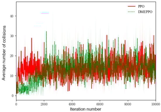 As can be seen from Figure 8, the system employing PPO had a high number of collisions from the beginning to the end, indicating that the PPO algorithm had not learnt how to make the driverless agricultural vehicle travel more safely. The number of collisions for the system employing DMEPPO gradually increased from 3 at the beginning to about 12, mainly because we set the operational efficiency mode so that it pursued a higher traveling speed, which made the traveling safe a “sacrifice”.