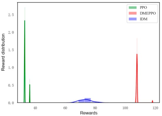 As can be seen in Figure 9, the DMEPPO model’s reward scores were high, with the reward scores concentrated around 105. Both the PPO model and IDM’s scores were low, with the PPO model’s mainly distributed between 35 and 40 and the IDM’s mainly distributed between 65 and 80. This indicates that the speed control strategy developed exhibited a certain level of dynamic responsiveness.