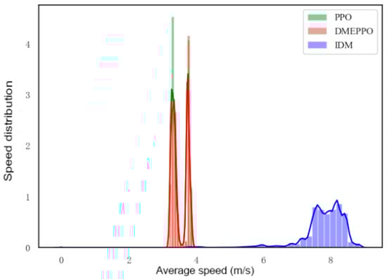 After training, a suitable DMEPPO-based speed decision-making model was obtained, which needed to be tested for its real-world effectiveness. Since the Intelligent Driving Model (IDM) is a rule-based model inbuilt in SUMO, the IDM was chosen as an alternative to PPO to provide a comparison. In order to test the adaptive ability of the speed decision-making models trained using different strategies—the DMEPPO and PPO models and the IDM—in dynamic environments, various types of dynamic obstacles were set up in the test environment. Figure 9, Figure 10, Figure 11, Figure 12 and Figure 13 show Kernel Density Estimations which show the distribution characteristics of the test data. The interpretation of kernel density maps mainly relies on the shape and distribution of the curves. The curve in a kernel density map represents the probability density estimation of the data. The higher the curve, the higher the density of the data point at that position.