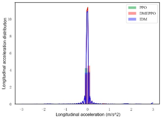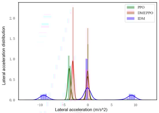 From Figure 10, it can be seen that the longitudinal velocities obtained using the DMEPPO and PPO models were mainly concentrated around 3–4 m/s due to balance considerations, while the IDM has a rule-based design, and the velocity distribution was mostly around the set limit value of 8 m/s. From Figure 11 and Figure 12, it can be observed that the longitudinal accelerations for the three approaches were largely centered around 0 m/s2, i.e., the vehicle tended to travel at a longitudinal uniform speed to keep the driving smooth. In order to examine the lateral stability of the unmanned agricultural vehicle, the driving path in this paper was set up as a double-shifted line. Under PPO and DMEPPO, the lateral acceleration was −4 m/s2 and −3 m/s2, respectively, while using the IDM it reached ±10 m/s2, which very easily caused lateral instability and was also due to the over-pursuit of efficiency of the IDM.