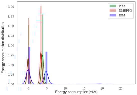 From Figure 13, it can be seen that the energy consumption under both DMEPPO and PPO was lower than when using the IDM, mainly concentrated around 4 mL/s, and both of these strategies maintained the balance of energy consumption, with DMEPPO consuming slightly less energy and being the most energy-efficient. The IDM consumed the highest amount of energy, up to 5 mL/s, and it achieved high efficiency at the cost of higher energy consumption.