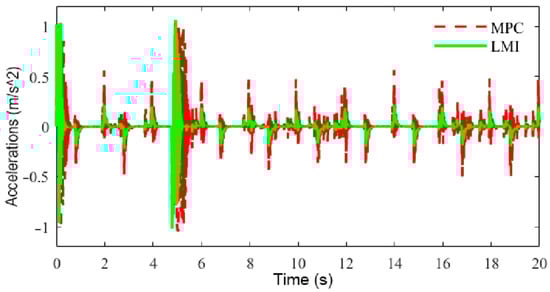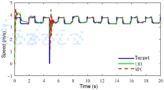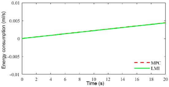 As can be seen from Figure 16, the acceleration with LMI-based control was within −0.2–0.2 m/s2, and the velocity control was smoother, while the acceleration with MPC was generally within −0.5–0.5 m/s2, and the acceleration was larger, and at the same time, velocity control based on MPC significantly lagged behind that based on LMIs when acceleration and deceleration control was carried out, which indicates that LMI-based control had a better response capability than MPC. From Figure 17, it can be seen that compared with MPC, the speed tracking control achieved with LMIs consumed less energy.