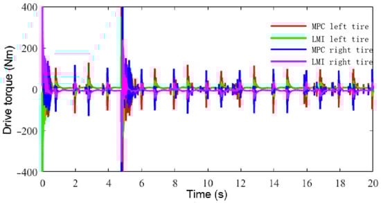Figure 18 shows a comparison of the driving torque of the agricultural vehicle’s rear drive wheels when using the MPC and LMI controllers. The driving torque with MPC was significantly higher than that with LMI-based control, with greater fluctuations. In addition, the output torque with LMI-based control was greater than that with MPC, which proves that the designed speed controller has good robustness, stability, and response performance.