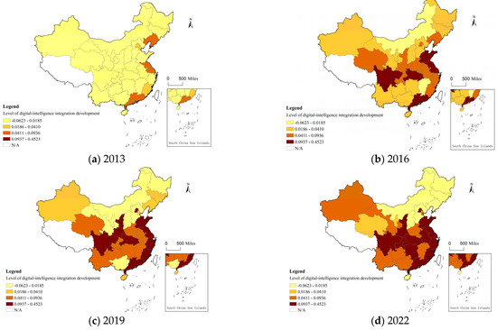 Based on the measurement results of the composite system synergy model, the spatio-temporal evolution map of the development level of digital intelligence integration in China is drawn, so as to analyze the evolution trend of the development level of digital intelligence integration at the provincial level in China from 2013 to 2022. The result is shown in Figure 2.