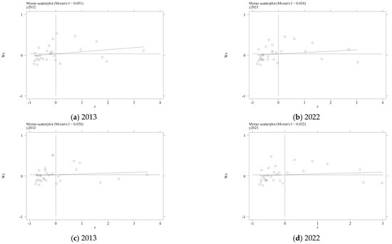 It can be seen from Figure 3 that the scatter plots corresponding to the Moran’s I of the quantity and quality of green technological innovation among provinces are mostly distributed in the first and third quadrants, indicating that each province has strong spatial positive correlation characteristics in local space, which correlates with the test results of the global Moran index. From 2013 to 2022, the number of provinces falling into the first and third quadrants increased, reflecting the increasing correlation of the quantity and quality of green technology innovation in some regions. The test results of both the global Moran’s I and the local Moran’s I show that the quantity and quality of green technology innovation in different regions of China do not exhibit a completely random state, that is, green technology innovation activities among regions do not exist in isolation, but exhibit certain spatial agglomeration characteristics. Therefore, the above spatial autocorrelation test results provide a statistical logical support for this paper to construct a spatial econometric model to explore the spatial spillover effect of digital intelligence integration development on the quantity and quality of green technology innovation in China.
