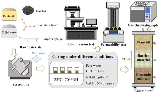 Subsequently, the formed barrier material samples were immersed in corresponding acidic, alkaline, and saline solutions (HCl solution with pH = 2, NaOH solution with pH = 12, and 5% CaCl2 solution by mass) to simulate different environmental influences. After a fixed immersion time, the barrier material samples were removed and subjected to unconfined compressive strength and permeability tests. Concurrently, the barrier material samples were placed in soil columns for contaminant barrier experiments. After a fixed diffusion period, the contaminant concentrations in the upper, middle, and lower layers were measured using a meteorological analyzer to assess the diffusion barrier performance of the material. The preparation and analysis flowchart of barrier materials is shown in Figure 1.