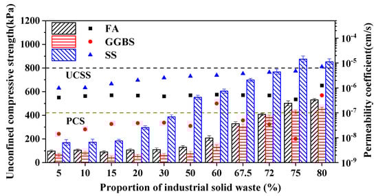 As illustrated in Figure 2, the compressive strength of the barrier materials increased significantly with a higher proportion of industrial solid waste, particularly with the inclusion of steel slag (SS), which nearly tripled the compressive strength, exceeding the unconfined compressive strength standard (UCSS). This enhancement was attributed to the high hardness of the steel slag [25]. In contrast, regarding the influence of industrial solid waste on the permeability coefficient of the barrier materials, S95-grade GGBS and low-calcium fly ash exhibited a smaller cumulative pore volume and porosity compared to steel slag [26]. Consequently, the changes in the permeability performance of the blended barrier materials were more gradual with varying proportions; all blending ratios, except for the 80% blend, met the permeability coefficient standard (PCS). Additionally, the blending ratio of industrial solid waste was found to significantly affect the barrier performance of the materials [27].