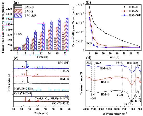 Upon further observation of the BM-S/F modified material, a more prominent absorption peak corresponding to the vibration of the fluorine-silicon bond appears in the lower wavenumber region (such as 800–1000 cm−1). These phenomena further indicate that the molding rate of the barrier material has accelerated after binder modification. Furthermore, the co-modification with sodium fluosilicate further shortened the barrier formation time. XRD and infrared spectroscopy analyses in Figure 4c,d revealed that this phenomenon was due to the additional formation of strengthening compounds—calcium fluoride and magnesium fluoride—resulting from incorporating sodium fluosilicate. This enhancement enabled the materials to achieve higher levels of unconfined compressive strength in a shorter timeframe, thereby facilitating rapid barrier formation.