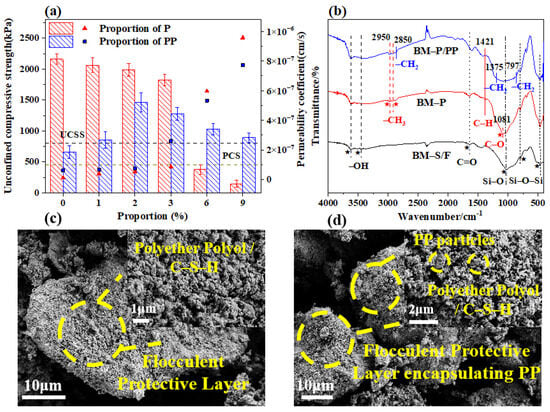 Additionally, as illustrated in Figure 5b, in the BM-P group, new absorption peaks corresponding to the methyl and ether bonds introduced by polyether polyols appeared. Additionally, the typical chemical groups in the molecular structure of polyether polyols, such as the oxygen (–O–) and hydroxyl (–OH) groups, made the material potentially affinitive to acid, alkali, and salt solutions [40]. In the BM-P/PP group, a methyl rocking vibration peak appeared due to the incorporation of polypropylene. Polypropylene (PP) is a typical non-polar plastic, composed primarily of carbon-hydrogen units in its molecular structure, and exhibits low chemical reactivity [41]. Furthermore, as shown in Figure 5b, FTIR spectra confirm the characteristic peaks of C–O–C (1100 cm−1) and –CH3 (1375 cm−1) in BM-P/PP, which demonstrate that the polymer interacts with the gel structure through physical adsorption.