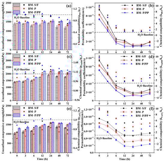 Moreover, an examination of the chemical compatibility indices in Figure 6b,c revealed that some alkali-treated materials exhibited superior barrier performance. This improvement was due to the hydroxide ions present in the alkaline solution, which enhanced the alkalization of the barrier materials during the molding process [7], allowing for a further enhancement of barrier performance. This indicated that the polymer-modified barrier materials demonstrated excellent alkali resistance and could benefit from exposure to strong alkaline environments. This phenomenon aligned with the fundamental characteristics of alkali-activated materials.