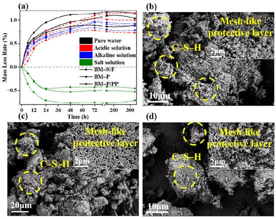 Analysis of the mechanisms of acid-base resistance in polymer-modified barrier materials. (a) Mass loss of polymer-modified materials under different environmental influences. (b) Polymer-modified materials in acidic environments, (c) in alkaline environments, and (d) in saline environments.