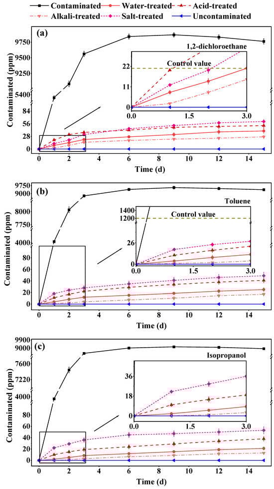 The different VOC barrier effectiveness of the modified materials. (a) 1,2-dichloroethane. (b) Toluene. (c) Isopropanol.