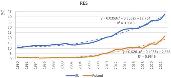 In order to answer the first two research questions (RQ1 and RQ1a), the time series of the shares of renewable energy in the total energy production of the EU and Poland were analyzed (Figure 2).