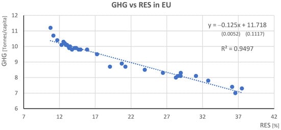 In order to investigate the dependence of the amount of greenhouse gas emissions on the share of RES in energy production in the European Union (RQ1), a scatter plot of these variables was created (Figure 3). It shows a firm, linear relationship between the variables studied. The Pearson linear correlation coefficient, r, was calculated to confirm this and test the H1 hypothesis. It amounted to −0.97 (p-value = 0.000), which implies a very high linear negative relationship, confirming the impact of RES on emission reductions. As the share of RES increased, GHG emissions decreased. The equation of the regression line has been included in the graph. Its high coefficient of determination (R2 = 0.95, F = 585.3, p-value = 0.000) confirmed that RES had an almost 95% impact on EU GHG emission variability. The slope of the regression line shows that an increase in the share of RES of 1% on average was accompanied by an average decrease in emissions of approximately 0.125 tons per capita.