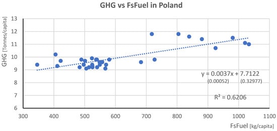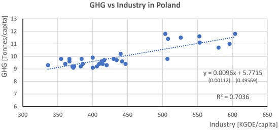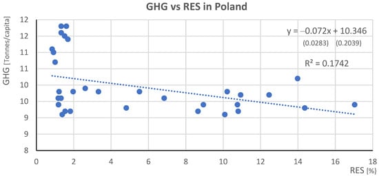 The correlation was much lower this time, albeit significant: r = −0.42 (p-value = 0.016). This also confirmed that a decrease in emissions accompanied the increase in RES. However, because of a too low (in terms of the modulus) correlation coefficient, the estimated regression line should not be interpreted this time (R2 = 0.17, F = 5.54, p-value = 0.016), as it only explains 17% of the GHG emissions development. At this stage, it could be concluded that other factors could have had a much more significant impact on GHG emissions in Poland.