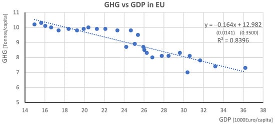 However, the results for the EU did not always coincide with those of individual member countries regarding the existence of correlations. Also, a rather interesting result arrived in the context of GDP. For the EU as a whole, GDP was negatively correlated with GHG emissions. A decrease in GHG emissions accompanied an increase in GDP in the EU. Thus, in Poland and six other countries, the correlation was insignificant. The results for the EU followed those obtained for the USA by [] (as opposed to the other countries studied there: Russia, Japan, China, and India) and [] (for France, Germany, Canada, Italy, and the UK). However, they were the opposite of those obtained by, e.g., [,]. At the same time, the study [] considered not the size of GDP itself but its percentage increase from year to year, which should change the interpretation. That confirms a certain non-stability in the strength and direction of the dependence of GHG emissions on GDP, as shown in []. An explanation could be the assumption that as the wealth of a country increases, more funds are directed towards sustainability solutions. For example, the article [] showed a positive relationship between GDP and investment in photovoltaic installations in the EU. It supports the decoupling and environmental Kuznets curve hypotheses [,]. That may also imply that GDP growth on some level can reduce greenhouse gas emissions, depending on structural and technological changes.