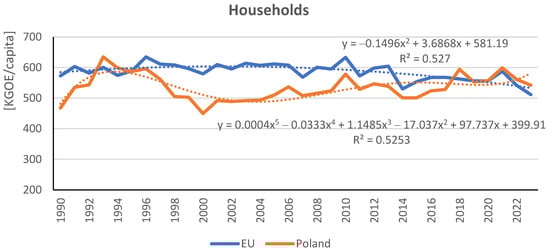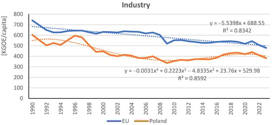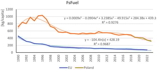 Regarding the EU, the final consumption of fossil fuels followed a logarithmic trend (R2 = 0.97, F = 960.3, p-value = 0.000). In contrast, the situation in Poland itself was different. After an initial increase in this consumption (until approximately 1996), it fell sharply, remaining relatively flat for some time (from 2000) before starting to fall slightly again (from around 2013). Due to this turbulence, the best-fitting trend for this period appeared to be a polynomial trend of the 5th degree (R2 = 0.93, F = 71.7, p-value = 0.000).