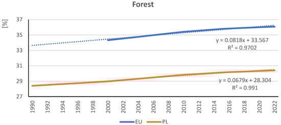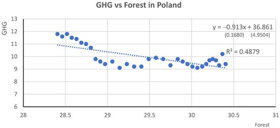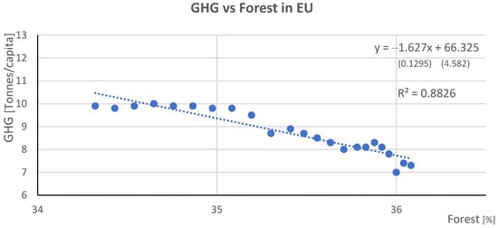 Regarding forest area, the correlation with GHG emissions was significant for 19 countries, except for Austria, Bulgaria, Croatia, Cyprus, Finland, Latvia, Slovenia, and Spain.