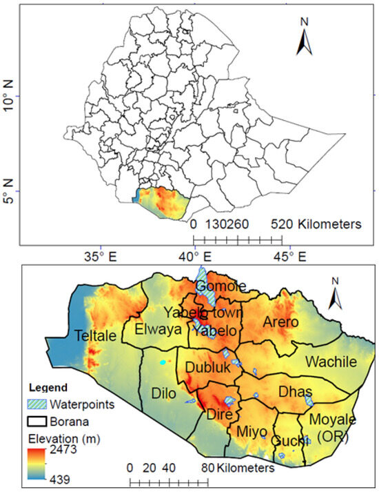 Figure 1 depicts the Borana zone with an area of approximately 44,203 square kilometers. The Borana zone elevation varies between 439 and 2473 m above sea level. The study area is geographically extended between latitudes 3°30′ N and 5°25′ N and longitudes 36°40′ E and 39°45′ E. The Borana community’s mainstay is small-scale farming and livestock production, both of which are highly affected by the climate variability and frequent droughts. Implementing the livestock water and pasture monitoring and EWS in the Borana zone aims to strengthen pastoral communities’ climate resilience by providing timely information on water and pasture availability. This EWS is essential for improving livestock management traditional practices by enabling timely updates that help herders make informed decisions about when and where to relocate their livestock. Therefore, a stakeholder analysis involving all relevant actors in the livestock sector can enhance the functionality and scalability of the EWS.