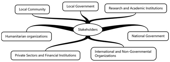 Four essential attributes, including power, legitimacy, urgency, and proximity, were then used to identify the final list of stakeholders considered in this study [27,28,29]. The stakeholder mapping process enabled the identification of key actors, their influence, and their stakes in the EWS. Overall, the selected stakeholders were then grouped into seven categories: national government, private sector and financial institutions, local government, local community, academic and research institutions, international and non-governmental organizations, and humanitarian organizations. This stakeholder classification is crucial for figuring out each stakeholder’s appropriate level of engagement in the decision-making process based on their ability to represent the interests of their group [23].