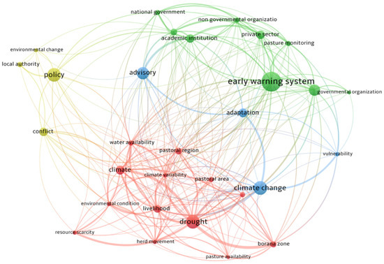 Figure 4 depicts the frequency and networks of keywords created based on the responses of participants. The most repeated keywords, with frequencies of occurrence above 10, from the participant responses are reflected in the network. The network also shows how frequently each stakeholder group, among the seven clustered groups, used the keywords. The most frequent keywords are represented by the size, which is linearly correlated with the frequency words. This helps to visually understand the interests and needs of stakeholders, as the most frequent words reflect the main focus of the participants. From the keyword frequency analysis, stakeholders most frequently used the following keywords: early warning systems, climate change, advisory, adaptation, policy, drought, water availability, pasture availability, environmental change, vulnerability, conflict, resource scarcity, and herd movement.