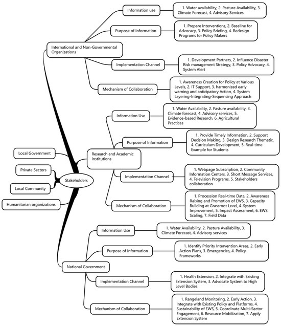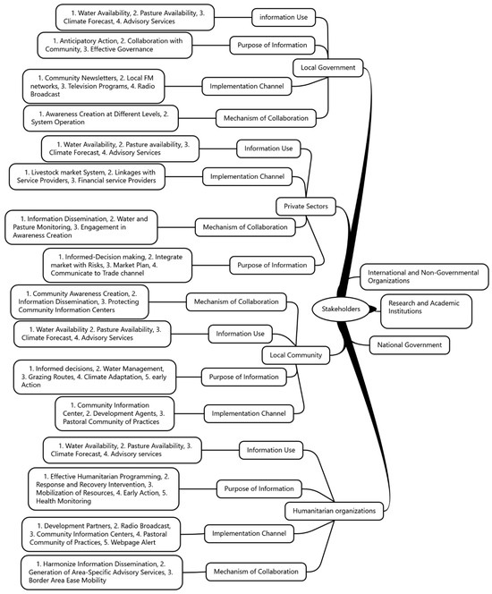 Figure 5 and Figure 6 show the stakeholder analysis findings based on an EWS’s use of system information, information purpose, information implementation channels, and mechanisms of collaboration. Local communities highlighted the importance of seasonal advisories to guide their herd movements. Local communities have also expressed concerns about the availability of technology in remote places for accessing pertinent EWS information. To address this issue, participants concurred that it was critical to ensure that the EWS is accessible through a variety of dissemination channels, including Community Information Centers (CIC) and Short Message Service (SMS). Stakeholders stressed the importance of training and capacity building to help users understand and effectively utilize an EWS. Moreover, stakeholders also highlighted the necessity of integrating indigenous knowledge in the EWS towards improving the applicability of information in the pastoral region. To ensure the long-term sustainability of the EWS, it is essential to foster collaboration among diverse stakeholders, including government bodies, NGOs, and local communities. By integrating the EWS into existing policies and mobilizing resources collectively, these partnerships can enhance resilience and effectiveness. This collaborative approach will facilitate the adaptation of the EWS to evolving challenges and needs in various contexts.