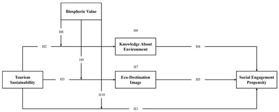 Individuals with high biospheric values are more likely to seek, process, and apply environmental knowledge, strengthening the link between tourism sustainability and awareness of environmental issues [18]. In contrast, those with low biospheric values may not internalize sustainability information as deeply, resulting in a weaker relationship [92]. For example, the influence of tourism sustainability on eco-destination image depends on tourists’ value orientations. Those with strong biospheric values evaluate destinations based on sustainability efforts and conservation initiatives, reinforcing the destination’s eco-friendly reputation [41,90]. However, for tourists with low biospheric values, the impact of sustainability initiatives on eco-destination image may be less pronounced [18]. Tourists with high biospheric values feel a stronger moral obligation to engage in sustainability-related social interactions, making them more likely to participate in conservation programs, community-based tourism, and eco-tourism activities [37,44,93]. Conversely, those with low biospheric values may not perceive social engagement in sustainability as a personal responsibility, weakening the effect of tourism sustainability on social engagement propensity [20,31]. Based on the VBN framework and the moderating role of biospheric values (Figure 1), the following hypotheses are proposed:
