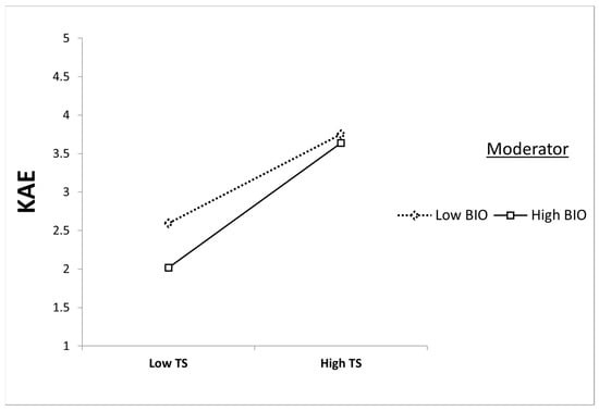 Biospheric values moderate the relationship between tourism sustainability and knowledge about the environment, with the positive relationship being stronger among tourists with high biospheric values compared to those with low biospheric values.