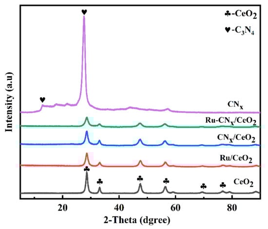 The crystal structures and phase compositions of the prepared samples were investigated by XRD. As illustrated in Figure 1, the XRD patterns of CeO2, Ru/CeO2, CNx/CeO2, and Ru-CNx/CeO2 catalysts show characteristic diffraction peaks at 28.6, 33.2, 47.6, and 56.6°, corresponding to the (111), (200), (220), and (311) crystal planes of the CeO2 with a cubic fluorite-type structure (PDF#75-0076) [35,36]. The CNx sample exhibits two distinct peaks at 12.7 and 27.7°, corresponding to (002) and (100) plane of the C3N4 phase (PDF#87-1523) [37]. It is noteworthy that no diffraction CNx or Ru species peaks are observed in the Ru/CeO2, CNx/CeO2, and Ru-CNx/CeO2 samples, which may be attribute to the high dispersion of Ru and CNx species, amorphous phase, or too low loading in the catalysts [21,38].