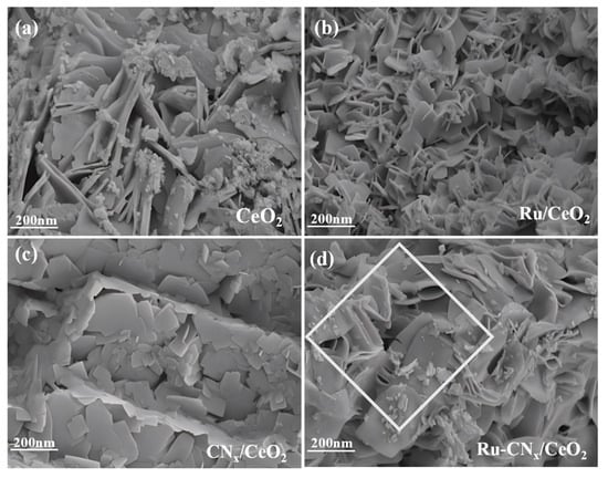 The SEM technique is widely used for characterizing and analyzing catalyst morphology. Figure 2a–d exhibits the SEM images of CeO2, Ru/CeO2, CNx/CeO2, and Ru-CNx/CeO2 samples, respectively. Figure 2a shows that the pure CeO2 catalyst mainly presents a nanosheet structure. The Ru/CeO2 catalyst has a more uniform, thinner, and smaller nanosheet than the pristine CeO2 sample owing to the introduction of Ru, as shown in Figure 2b. Meanwhile, the CNx/CeO2 catalyst also displays nanosheet with clean surfaces, as depicted in Figure 2c. Interestingly, Figure 2d shows that the Ru-CNx/CeO2 catalyst has a nanosheet structure similar to that of the CeO2 sample, but with a thinner thickness (shown in the white frame). The above results demonstrate that the introduction of Ru and CNx preserves the nanosheet morphology of CeO2 sample while significantly reducing the nanosheets thickness.