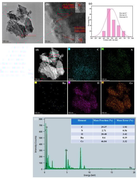 Figure 3 depicts the TEM images and elemental mappings of Ru-CNx/CeO2 catalyst. Figure 3a reveals that the Ru-CNx/CeO2 sample displays a morphology of thin nanosheets, demonstrating agreement with the SEM results. The HR-TEM image of Ru-CNx/CeO2 sample in Figure 3b shows lattice planes of 0.32 and 0.31 nm that are assigned to the planes of CeO2 (111) and RuO2 (110) [41,42]. Figure 3c displays the particle size distribution of CeO2 for the Ru-CNx/CeO2 sample. As observed, the majority of CeO2 particles are in the range of 4.2 to 6.7 nm, with an average particle size of 5.4 nm, which matches well with the Scherrer equation result (6.3 nm). Nevertheless, the EDS mapping images and corresponding elemental analysis reveal a uniform distribution of C, N, Ru, O, and Ce elements on the surface of the Ru-CNx/CeO2 catalyst (Figure 3d,e). Notably, Ru and CNx species are not observed in the TEM images, possibly due to their high dispersion and low concentrations. These results are in agreement with the XRD results.
