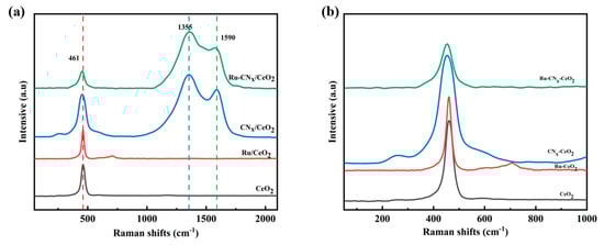 The lattice distortions and structural defects are analyzed using UV Raman spectroscopy. Figure 4a displays the UV Raman spectra of the different samples. The peaks at 1340 and 1598 cm−1 are observed on the Ru-CNx/CeO2 and CNx/CeO2 catalysts, which are attributed to the carbon species with D (defect) and G (graphitization) [43,44]. Additionally, the peak near 461 cm−1 is observed clearly on all the prepared catalysts, corresponding to the F2g Raman vibrational mode of CeO2 [45,46]. Figure 4b displays the magnified spectral feature centered at 461 cm−1 associated with the synthesized catalyst. The Ru-CNx/CeO2 catalyst exhibits the most pronounced Raman shift from 461 to 454 cm−1, arising from the formation of Ru-O-Ce structures that induce lattice distortion in the CeO2 matrix, accompanied by a red shift in the F2g vibrational mode [34].
