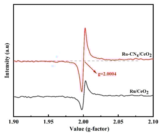 EPR is a powerful technique for characterizing the oxygen vacancies (Ov) in a catalyst [47]. Figure 5 presents the EPR spectra for the Ru/CeO2 and Ru-CNx/CeO2 catalysts. Notably, both catalysts exhibit prominent signals at g = 2.0004 which are attributed to Ov [48]. The Ru-CNx/CeO2 catalyst exhibits a stronger signal compared to the Ru/CeO2 catalyst, indicating a higher concentration of Ov present on the Ru-CNx/CeO2 catalyst. Consequently, the incorporation of CNx significantly augments the Ov content on the catalyst surface, thereby enhancing oxygen adsorption and activation capacities to generate more reactive oxygen species [49,50].