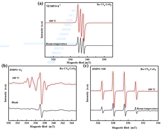 The generation of active species is regarded as the critical step in the CWO process [51]. In the reaction, the holes (h+), as a strong oxidizing species, can directly attack organic pollutants or promote the formation of ·OH [52]. In addition, ·O2 and ·OH species act as oxidizing agents, either directly oxidizing organic pollutants or indirectly generating reactive species, which enhances the degradation of organic [53,54]. The 2,2,6,6-tetramethylpiperidinooxy (TEMPO) and 5,5-diethyl-1-pyridine N-oxide (MDPO) are always used to study and detect radical reactions as radical scavengers [55,56,57]. Figure 6 shows that the signals of TEMPO-h+, MDPO-·O2, and MDPO-·OH species over the Ru-CNx/CeO2 catalyst are stronger at 180 °C than those at room temperature. The results demonstrate that the h+ (holes) and ·O2 and ·OH species exist on the Ru-CNx/CeO2 catalyst at the reaction temperature of 180 °C.