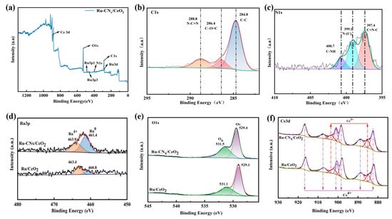 The O1s profiles of the catalysts are depicted in Figure 7e. The peaks at 529.1 and 529.4 eV are ascribed to surface lattice oxygen (OL). Additionally, peaks at 531.1 and 531.6 eV correspond to adsorbed oxygen species (OA) [63,64]. The higher binding energies of OL and OA on the Ru-CNx/CeO2 catalyst suggest a stronger ability for oxygen adsorption and activation [61]. It is noteworthy that OA/OL ratios on the catalyst increase from 0.45 to 0.72 with the addition of CNx. This indicates that the Ru-CNx/CeO2 composite exhibits a higher absorbed oxygen content and an enhanced capacity for oxygen adsorption from the surrounding environment, thereby promoting the formation of reactive oxygen species and improving catalytic performance [65,66].