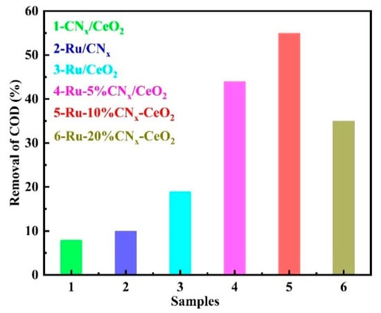 Subsequently, the impact of CNx loading on the performances of Ru-XCNx/CeO2 catalysts is investigated as depicted in Figure 8. The catalytic activities of Ru-XCNx/CeO2 catalysts exhibit a volcano-type trend depending on the loading of CNx. With the increase of CNx loading from 5 to 10%, the COD removal of Ru-XCNx/CeO2 catalyst increases from 45 to 55%. However, the activity of the catalyst progressively declines to 35% with a further increase in CNx loading from 10 to 20%. It demonstrates that excessive CNx loading may cover the active sites of Ru leading to a decrease in activity [61]. Among them, the Ru-CNx/CeO2 catalyst demonstrates the highest COD removal efficiency of 55%, proving that it possesses the strongest synergistic effect of CNx and Ru species.