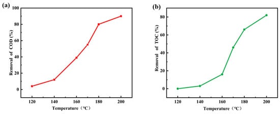 Reaction temperature is a critical factor in the CWO of organic compounds. According to the law of Arrhenius, the rate of the reaction increases with temperature [71]. Hence, the influence of the reaction temperature from 120 to 200 °C on the removal of COD and TOC over the Ru-CNx/CeO2 was investigated. As shown in Figure 9a,b, the removal of COD and TOC increases from 4 to 90% and 1 to 82% with the temperature increasing from 120 to 200 °C. Nevertheless, when the temperature is elevated from 180 to 200 °C, the removal efficiency of TOC and COD exhibits no substantial improvement. This phenomenon is likely attributable to the generation of recalcitrant intermediate compounds during the reaction process, thereby limiting further degradation [72].