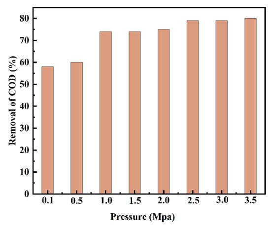 The oxygen pressure always has a strong relationship with the performance of the catalyst in the CWO reaction. Therefore, the influence of the oxygen pressure on the catalytic performance of Ru-CNx/CeO2 catalyst was investigated, as illustrated in Figure 10. The efficiency of COD removal significantly increases from 58 to 74% as the oxygen pressure is from 0.1 to 1.0 MPa. Notably, a further increase in oxygen pressure from 1.0 to 3.0 MPa, slightly improves the COD removal efficiency from 74 to 80%. Generally, the high oxygen pressures, i.e., high dissolved oxygen concentrations, facilitate the breakdown of organics during the CWO. Nevertheless, the above results indicate that excessively high dissolved oxygen concentrations do not significantly influence the degradation of MDEA, suggesting that the dissolved oxygen concentrations are above the stoichiometric concentration needed for the reaction as the oxygen pressure is >1.0 Mpa [30].
