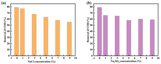 Figure 11. The effect of the concentration of inorganic salts on the removal of COD of the Ru-CNx/CeO2 catalyst, (a) NaCl concentration, and (b) Na2SO4 concentration (reaction temperature 180 °C, PO2 = 2.5 MPa, reaction time 30 min).