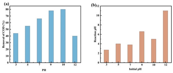 Figure 12. The effect of pH on the catalytic performance of Ru-CNx/CeO2: (a) COD removal, and (b) pH of the solution after reaction.