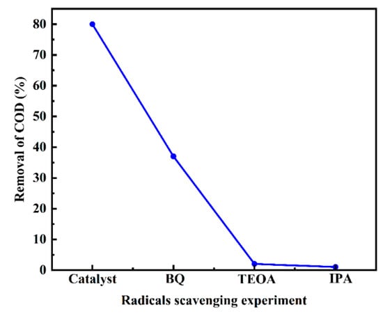 It is widely accepted that triethanolamine (TEOA), 1,4-benzoquinone (BQ) and isopropanol (IPA) can effectively quench the active species of holes (h+), ·O2, and ·OH [53,83,84], respectively. For the purpose of distinguishing the active species on the catalyst, a small amount of TEOA, BQ, and IPA were added to the reaction solutions, respectively. Figure 14 shows that the degradation efficiencies of MDEA decrease significantly to 37%, 2%, and 1% with the addition of BQ, TEOA, and IPA to the reaction system. This demonstrates that h+, ·O2, and ·OH are the main contributors to MDEA conversion.