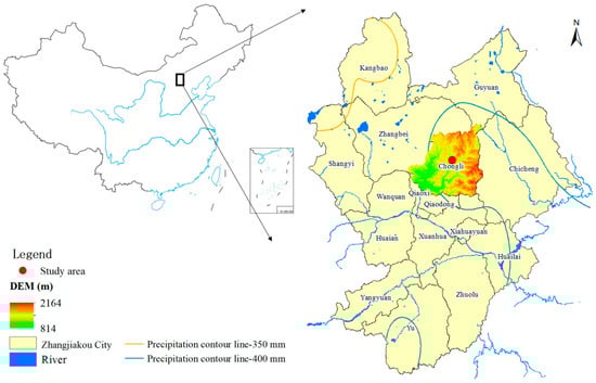 The study area is a typical hilly region in North China, situated in Chongli District, Zhangjiakou City, Hebei Province of China (40°47′–41°17′ N, 114°17′–115°34′ E) (Figure 1). Characterized by a continental monsoon climate, the region exhibits a mean annual temperature of 3.70 °C and receives 483 mm of precipitation annually. As a key venue for the 2022 Winter Olympics, extensive revegetation efforts were implemented to mitigate soil erosion, with shrublands and woodlands prioritized as primary restoration types.