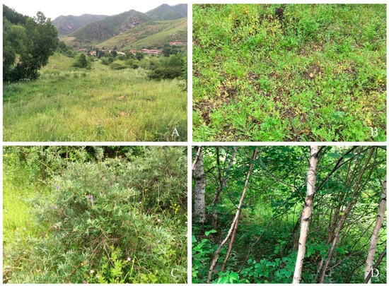 Images of the vegetation in the study site (A) and three different land-use types ((B), abandoned cropland; (C), shrubland; (D), woodland).