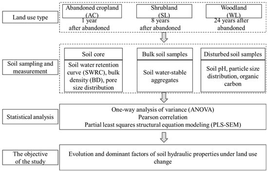 Three soil profiles were randomly selected as replications for each type of land use at each site. Undisturbed soil core samples were collected from soil layers (0–10 cm, 10–20 cm, 20–30 cm, and 30–40 cm) using 100 cm3 stainless-steel cutting rings. Bulk soil samples were collected using a shovel beside the cutting rings and carefully put in the tin box to avoid compaction before the measurement of soil aggregates. Finally, the disturbed soil samples were gathered as well. All the methods applied in this study were listed in the flowchart in Figure 3.