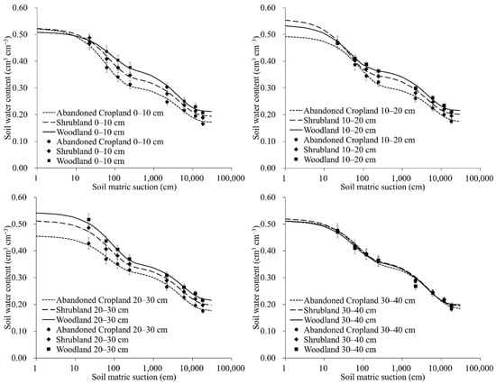 Soil water retention curves of three land-use types. The symbols and lines represent measured data and fitting results by using the double-exponential model; the error bar refers to the standard deviation of measured data (n = 3).