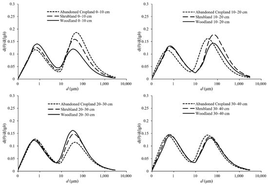 Soil pore-size distributions of three land uses as obtained from the double-exponential models fitted to soil water retention curves.