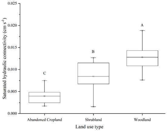 Soil saturated hydraulic conductivity of three land−use types. Different letters reveal significant differences among different land uses (p < 0.05).